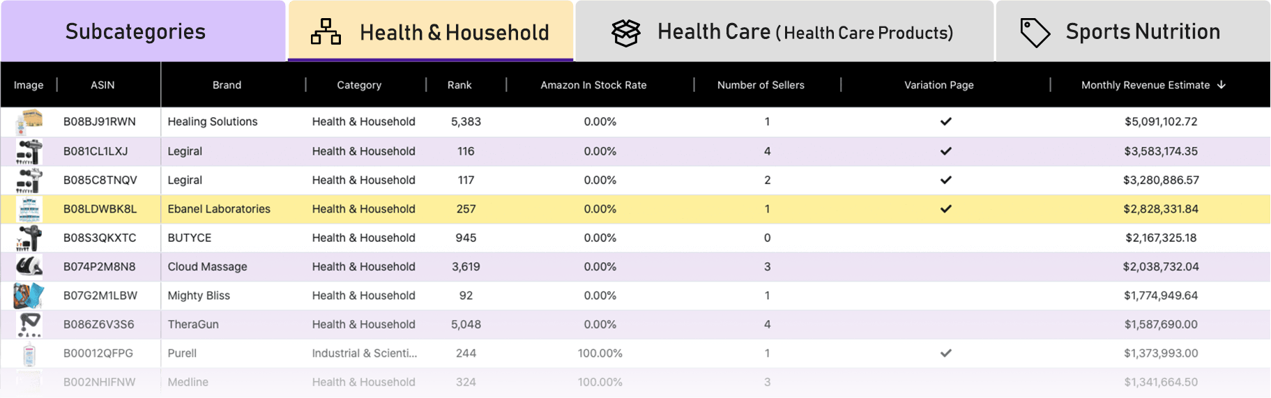 Unlock a database of products within any subcategory instantly. And see the info on their monthly revenue, rank, the number of FBA sellers, Buy Box price, review rating, and more.