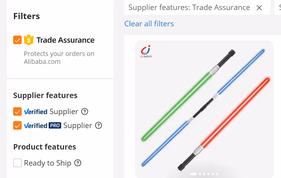 A lot of search results will show up, so you need to filter them out by verification and with trade assurance. This will guarantee that the only suppliers you see are verified by Alibaba, and any orders you make with them will be protected by Alibaba through the Trade Assurance program.
