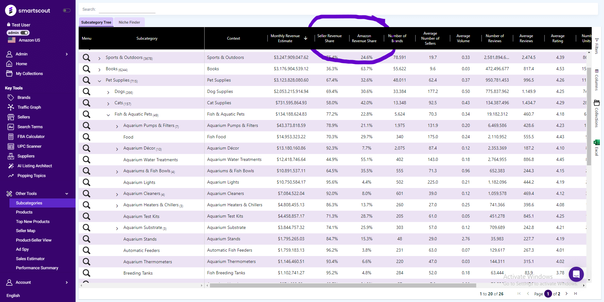The first step is to filter for Amazon’s presence in the subcategory. If they have a high percentage of the revenue, then you know if will be difficult to make room for yourself there. This can be done by examining the Amazon Revenue Share versus the Seller Revenue Share.